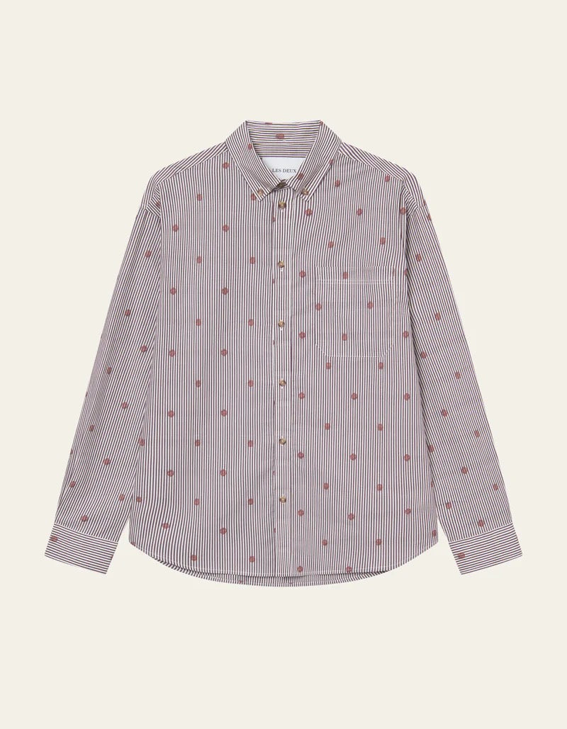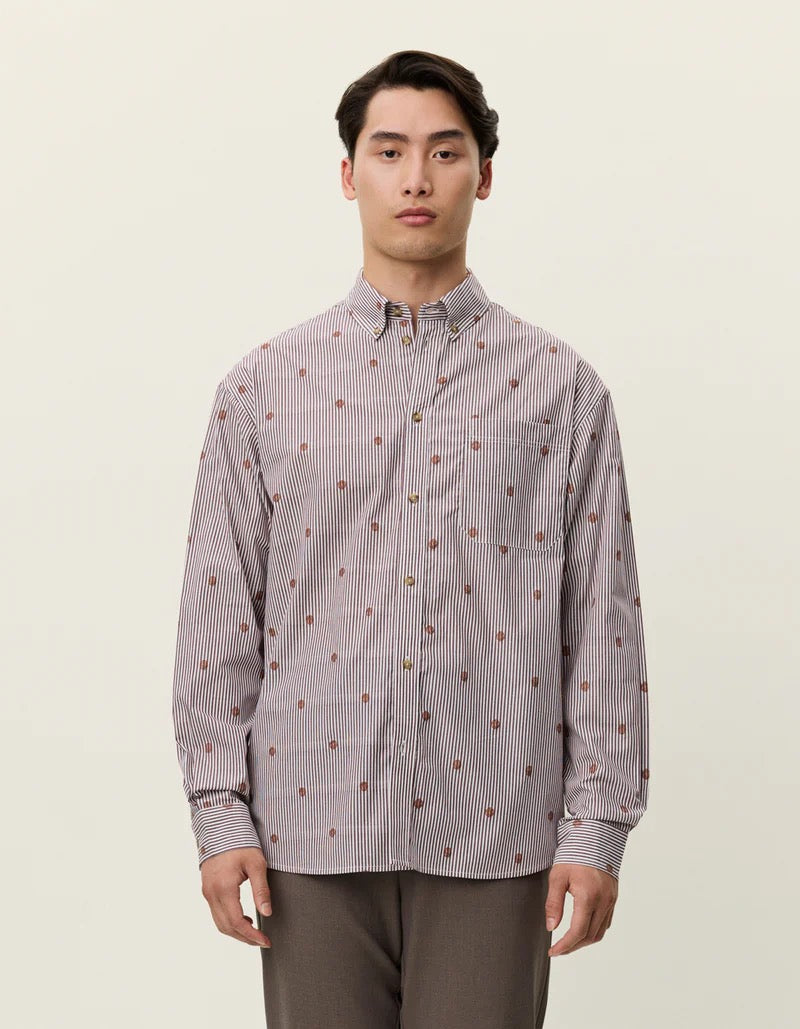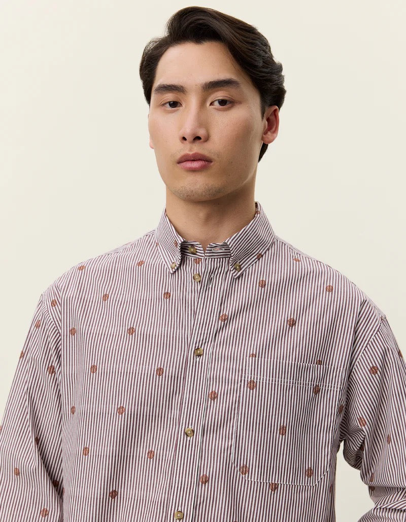 Une interprétation ludique de la chemise classique super legere. La Kolton présente une coupe carrée avec des rayures verticales et des motifs de basketball brodés sur toute la surface, réalisée en popeline de coton nette pour une allure décontractée.