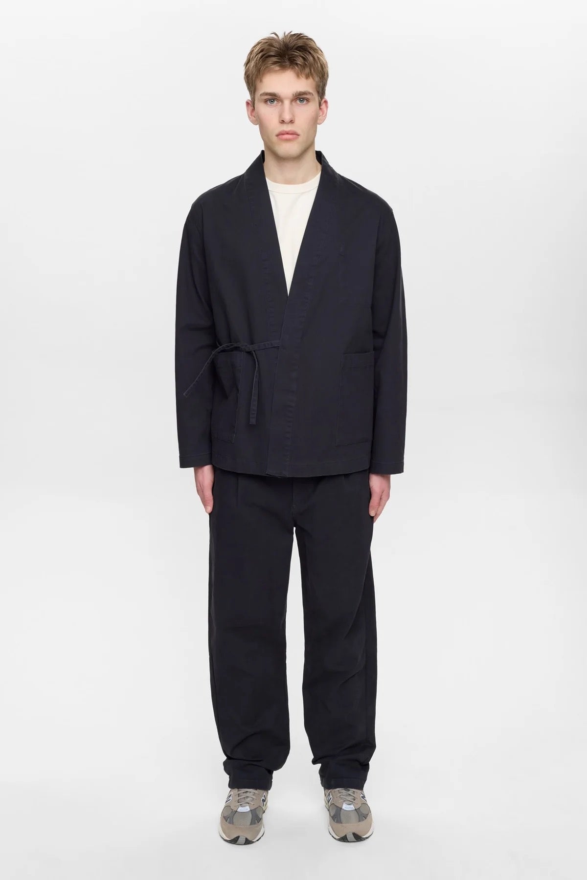 Un pantalon coupe droite. Tu peux le combiner avec sa veste ( KIMONO )