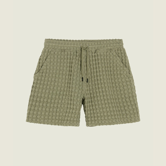 Le short gaufré Dusty Green Porto est tissé avec de généreuses quantités de coton pour une texture de gaufre qui est particulièrement douce et aérée contre la peau. Coupé pour une coupe décontractée, ce short est doté de plusieurs poches et d'un cordon de serrage confortable.