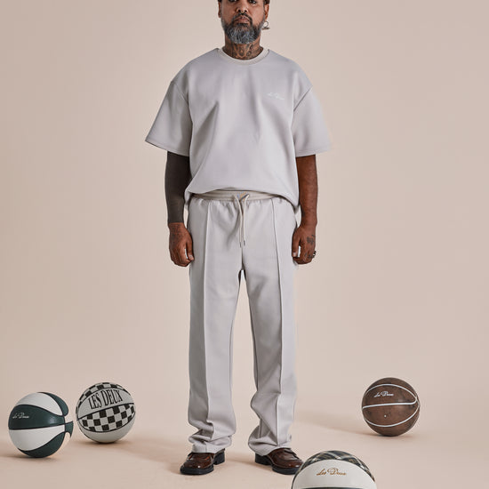 Pantalon de survêtement à coupe droite en tissu technique extensible.semblable au néoprène. Il est doté d'une taille à cordon de serrage et de plis pressés cousus pour une ligne nette et ajustée.