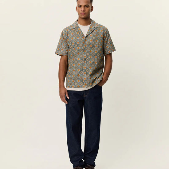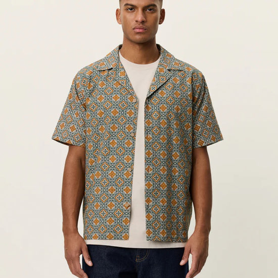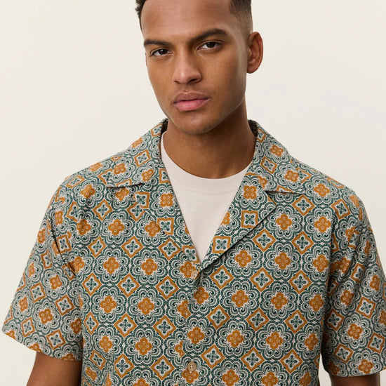 Une chemise légère à manche courte en coton structuré, imprimée d’un motif inspiré des arabesques sur toute sa surface. Présente un tombé décontracté et un col ouvert épuré.